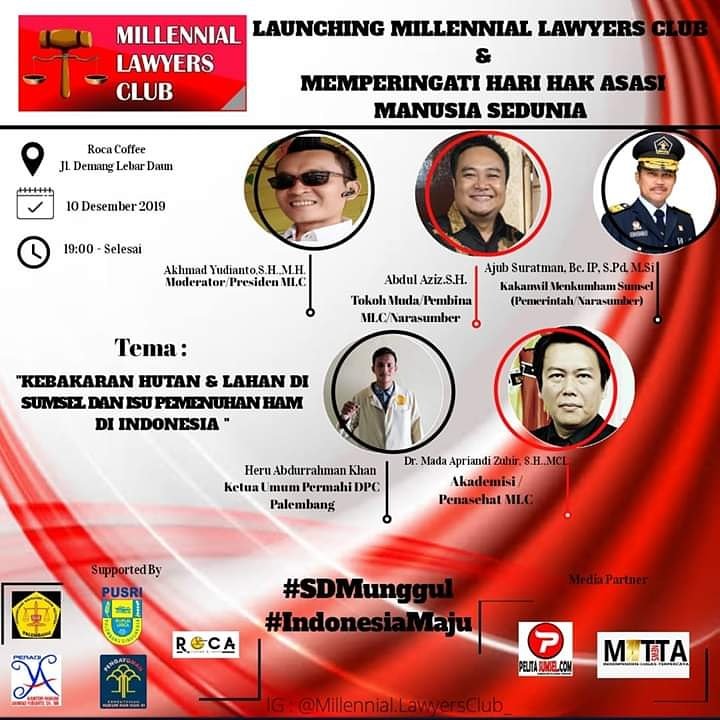 Sebagai diskusi perdana, Millennials Lawyers Club (MLC) yang akan diresmikan sekaligus memperingati Hari Hak Asasi Manusia Sedunia, Selasa (10/12/2019) di ROCA Coffee and Resto dengan Tema yakni ‘Karhutla Sumsel dan Isu Pemenuhan HAM’. “Pembicara ternama seperti Kakanwil Hukum dan HAM Sumsel, Akademisi dan para tokoh akan membahas persoalan tersebut,” pungkasnya.