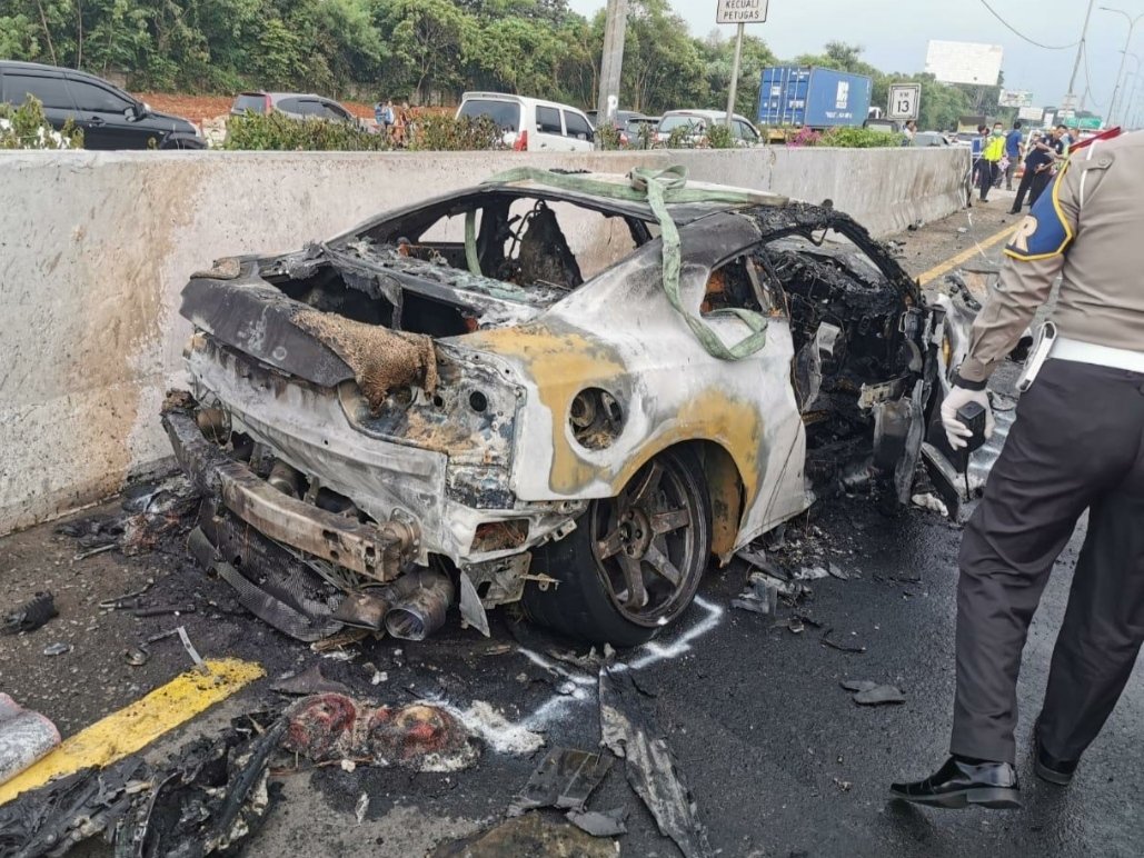 Mobil sport Nissan GT-R putih tersebut diduga menabrak pembatas hingga terbakar di Tol Jagorawi, arah Jakarta, saat di kawasan Cibubur, Jakarta Timur.