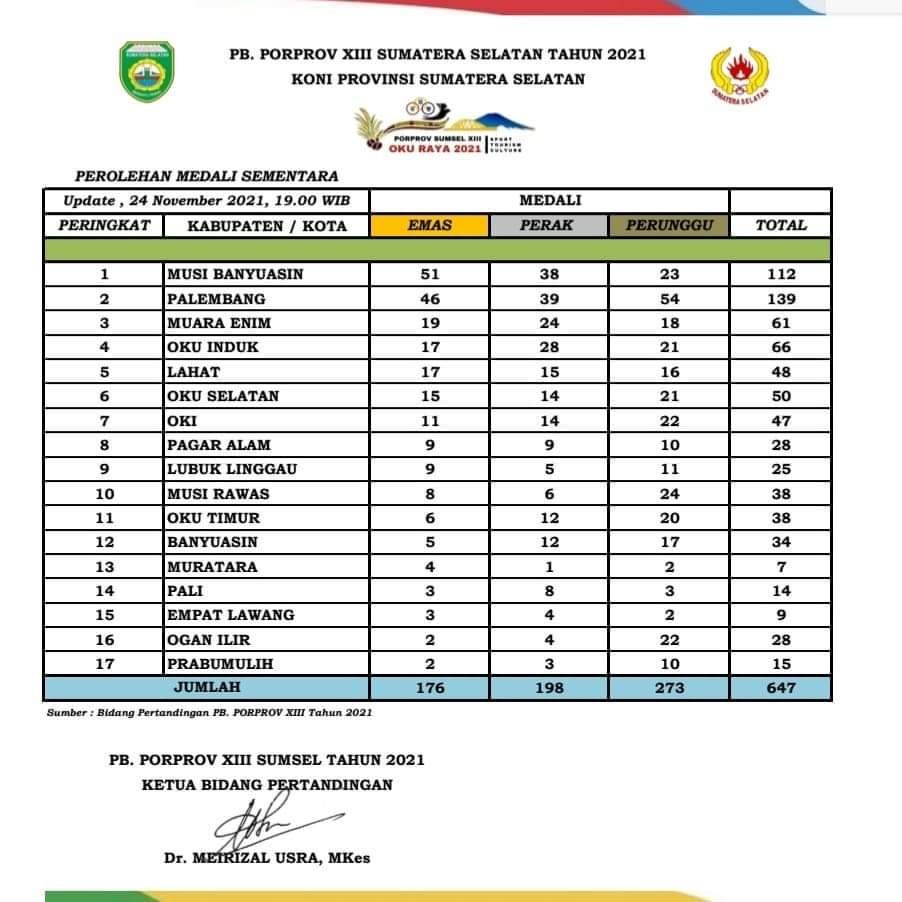 Hal ini diketahui pada rekapitulasi resmi PB Porprov XIII yang dirilis panita Porprov Sumsel. Hingga pukul 19.00 WIB, Rabu (24/11/2021) Kontingen Muba berhasil mengantongi total 112 medali.