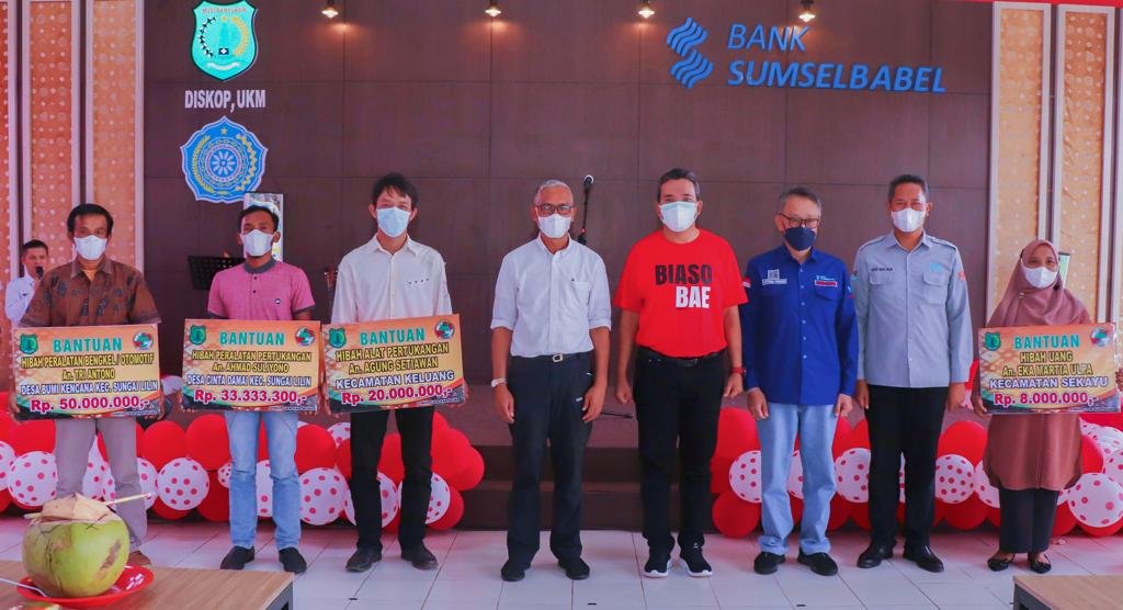 Pada kesempatan tersebut Plt Bupati Muba didampingi Direktur Bisnis Bank Sumsel Babel Antonius Prabowo menyerahkan beberapa bantuan berupa, Bantuan Hibah Peralatan Pembuatan Pakan Ternak Ayam Untuk 2 Kelompok tani di Kecamatan Sungai lilin masing-masing Rp. 100.000.000. Bantuan Hibah Peralatan Bengkel / Otomotif untuk 4 UKM di Kecamatan Sungai Lilin masing-masing Rp50.000.000. Bantuan Hibah Peralatan Pertukangan / Meubel untuk 3 UKM di Kecamatan Sungai Lilin masing-masing Rp33.300.000. Bantuan Hibah Peralatan Pertukangan / Meubel untuk 10 UKM di Kecamatan Keluang masing-masing Rp20.000.000. Bantuan Wirausaha Pemula untuk 39 UKM di Kecamatan Sekayu, Lais, Babat Supat, Sungai Lilin, Keluang, dan Tungkal Jaya masing-masing Rp8.000.000.