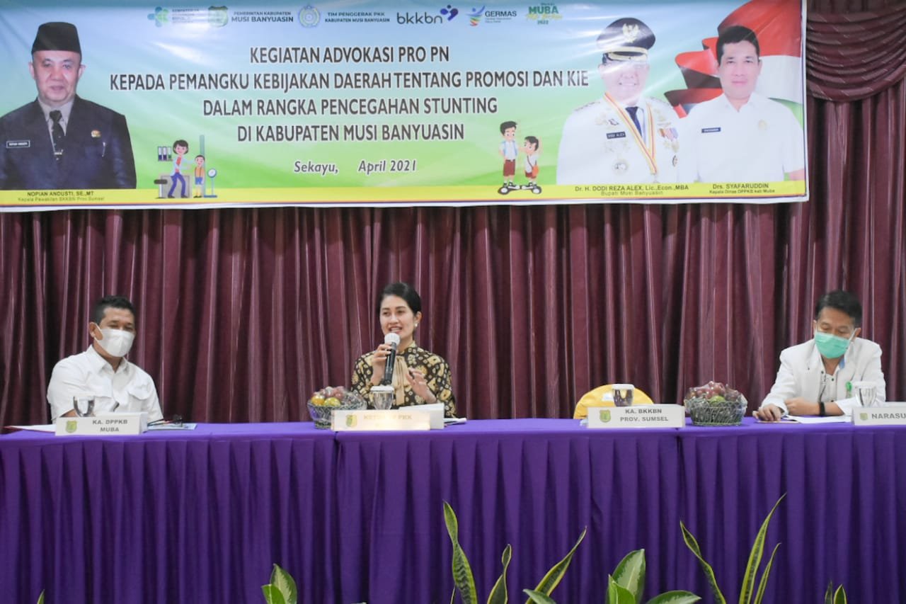 MATTANEWS.CO, MUBA – Kepala Perwakilan BKKBN Provinsi Sumatera Selatan Novian Andusti SE MT secara resmi membuka kegiatan Advokasi Pro PN Kepada Pemangku Kebijakan Daerah Tentang Promosi dan KIE dalam rangka Pencegahan Stunting di Kabupaten Musi Banyuasin Tahun 2021. Acara dilaksanakan oleh BKKBN Kabupaten Muba di Hotel Ranggonang Sekayu, Senin (05/04/2021)