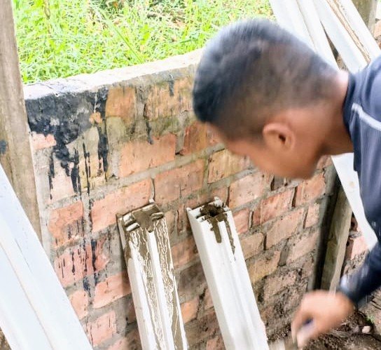 Terlihat sebelum di pasang, oleh satgas TMMD dan warga kampung Jawi, kusen plastik tersebut di isi dengan semen guna agar lebih kokoh dan tidak mudah pecah.