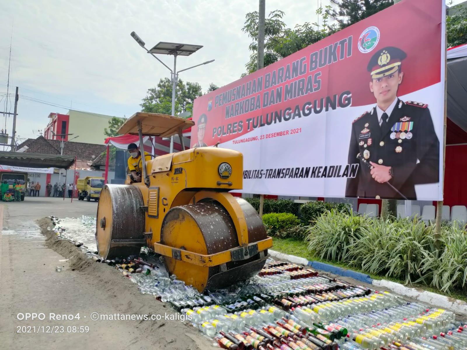 MATTANEWS.CO, TULUNGAGUNG – Kepolisian Resor Tulungagung menggelar pemusnahan barang bukti narkoba dan minuman keras di halaman Pemerintah kabupaten Tulungagung, Kamis (23/12/2021).