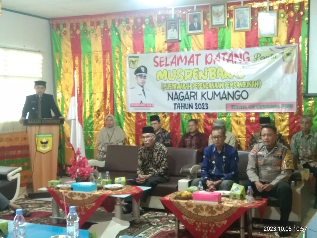 Tampak hadir di musrenbang Nagari Kumango, Perwakilan OPD Kabupaten, Mirza Azis, Camat Sungai Tarab, Iszamora Wali Nagari Kumango, juga Wali Nagari se kecamatan, Sungai Tarab, BPRN, Tokoh masyarakat dan undangan lainya.