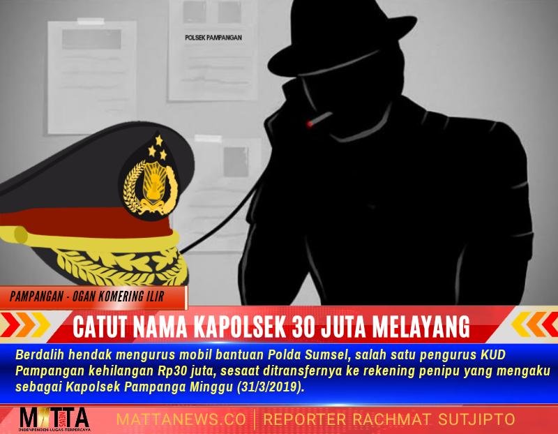 KAYUAGUNG, Mattanews.co – Berdalih hendak mengurus mobil bantuan Polda Sumsel, salah satu pengurus KUD Pampangan kehilangan Rp30 juta, sesaat ditransfernya ke rekening penipu yang mengaku sebagai Kapolsek Pampangan.