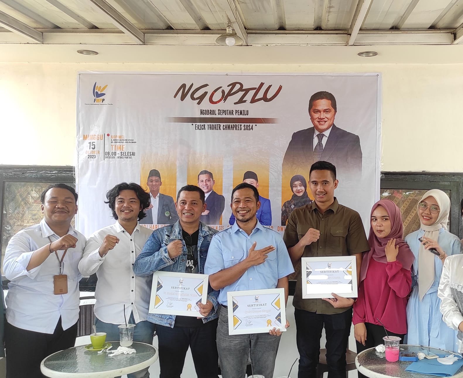MATTANEWS.CO, PALEMBANG – Forum Mahasiswa Pemantau Pemilu (FMPP) adakan Ngobrol Seputar Pemilu (Ngopilu) melihat sosok Erick Tohir sebagai kandidat kuat Calon Wakil Presiden (Cawapres) di kopi Umakku Palembang,Minggu (15/10/2023)