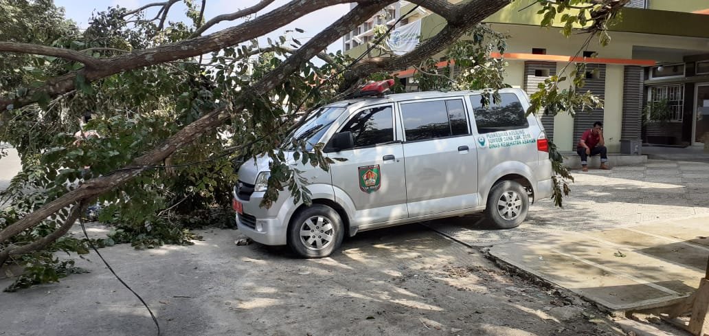 ASAHAN, SUMUT, Mattanews.co – Cabang batang pohon yang berada di pinggir jalan Abdi Setia Bakti, Sei Renggas, Kisaran Barat, Asahan, tepat disebelah RS Bunda Mulia menimpa mobil ambulance Puskesmas Keliling Dinas Kesehatan Kabupaten Asahan, Jumat (25/10/2019).
