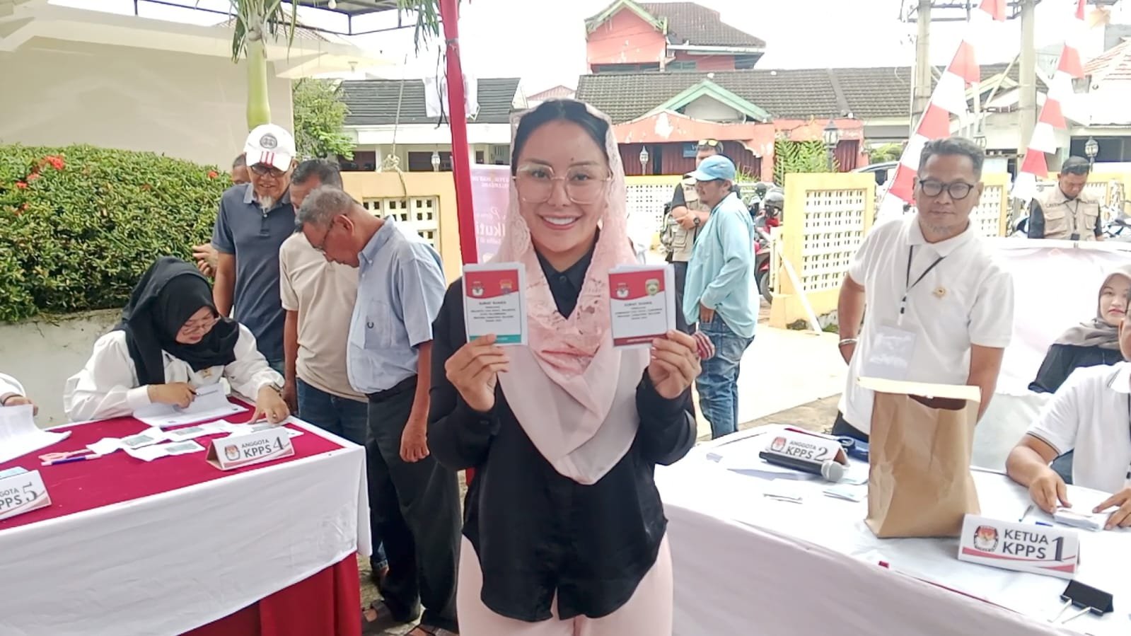 Diketahui, Nadriani Octarina datang dengan mengenakan busana dengan warna hitam dan merah jambu ini datang ke Tempat Pemungutan Suara (TPS) berserta rombongan pada jam 07.390p WIB dan menjadi peserta pemilih yang pertama.