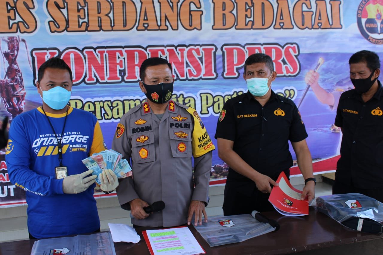Konfrensi pers itu dipimpin langsung oleh Kapolres Serdang Bedagai AKBP Robinson Simatupang didampingi Kasat Reskrim AKP Pandu Winata, Kasubbag Humas AKP Sopiyan, Kanit Tipikor IPDA Edward Sidauruk, di depan Halaman Mapolres Serdang Bedagai, Rabu (14/10/2020) sore.
