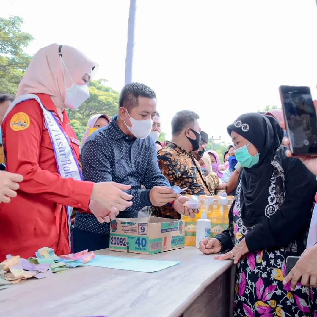 Wakil Bupati Karawang, H. Aep Syaepuloh bersama Atalia Prarataya Kamil istri Gubernur Jawa Barat ikut terjun langsung dalam operasi pasar murah minyak goreng tersebut.