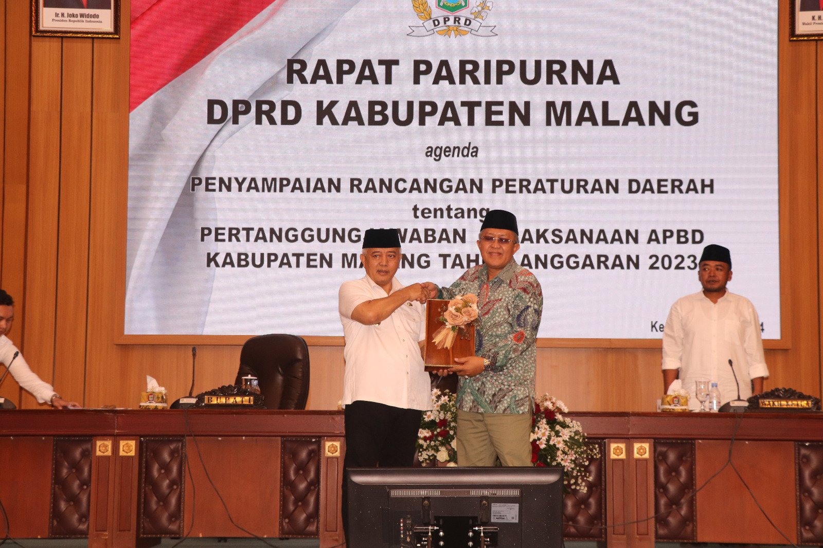 “Oleh karena itu pada kesempatan ini, Saya selaku Bupati Malang berkewajiban menyampaikan Rancangan Peraturan Daerah tentang Pertanggungjawaban Pelaksanaan Anggaran Pendapatan dan Belanja Daerah tahun anggaran 2023 dihadapkan Rapat Paripurna Dewan yang terhormat,” terang Bupati Malang.