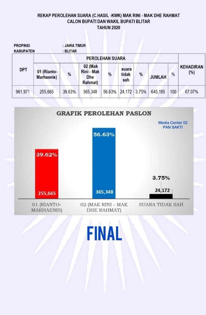 Hasil hitung cepat dapat diketahui, berdasarkan penghitungan suara dari 2.278 TPS di Kabupaten Blitar. “kita nyatakan paslon nomor 2 Mak Rini – Makdhe Rahmat Unggul pada kontestasi Pilkada Kabupaten Blitar Tahun 2020,” kata Heri yang juga anggota DPRD Jatim ini.