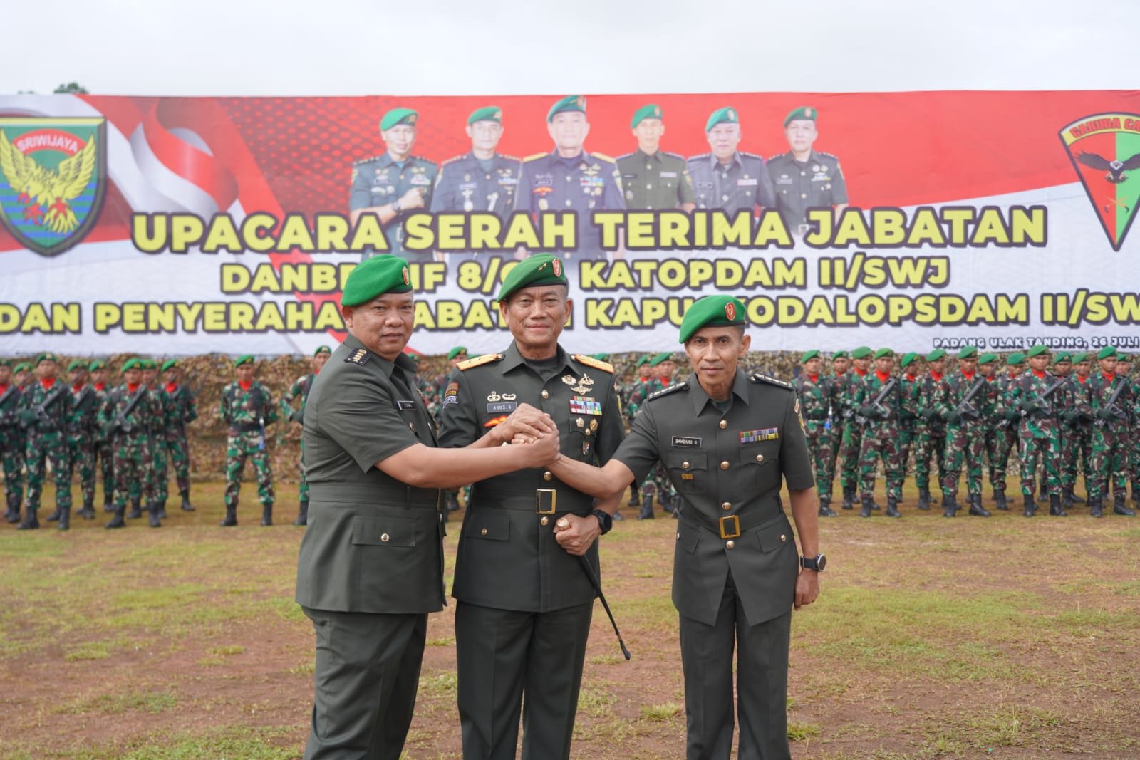 MATTANEWS.CO, PALEMBANG – Pangdam II/Sriwijaya, Mayjen TNI Agus Suhardi, memimpin upacara Serah Terima Jabatan (Sertijab) Danbrigif 8/GC dari Kolonel Inf Andar Dodianto Panggabean, S.I.P., kepada Letkol Inf Tuwadi, S.E., M.I. Pol. dan Katopdam II/Swj dari Kolonel Ctp Bambang Suhartono, S.T., kepada Kolonel Ctp Joni,