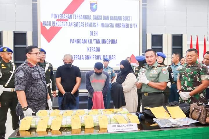 Pangdam XII/Tpr Mayjen TNI Iwan Setiawan dalam keterangannya menyampaikan bahwa hari ini dirinya menyerahkan barang bukti sabu seberat 15,75 Kg dan 3 tersangka kepada Kepala BNNP Kalbar.
