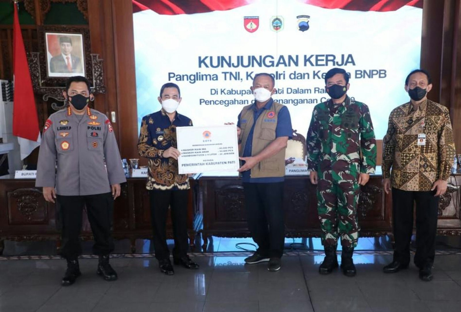 MATTANEWS.CO, JAKARTA– Panglima TNI Marsekal TNI Hadi Tjahjanto, S.I.P., didampingi Kapolri Jenderal Pol Drs. Listyo Sigit Prabowo, M.Si., dan Kepala BNPB Letjen TNI Ganip Warsito, S.E., M.M., melaksanakan kunjungan kerja dan rapat terkait penanganan Covid-19 di Kabupaten Pati Jawa Tengah,  bertempat di pendopo kabupaten Pati, Sabtu (5/6/2021).