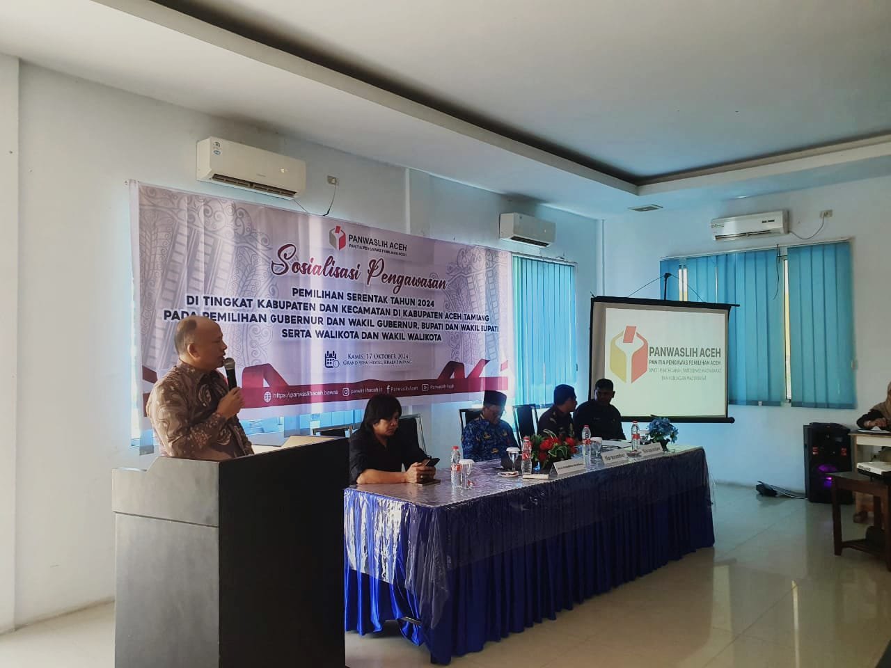 MATTANEWS.CO, ACEH TAMIANG- Panwaslih (panitia pengawas pemilihan) Aceh melakukan sosialisasi pengawasan tingkat kabupaten dan kecamatan di Kabupaten Aceh Tamiang bersama Ketua Panwascam, sekretariat dan PPL. Acara berlangsung di Grand Arya Hotel Karang Baru, Kamis (17/10/2024).