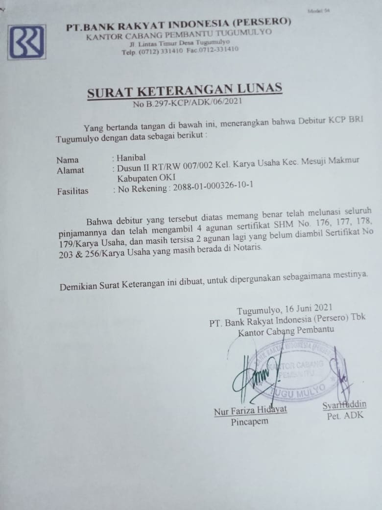 Baginya, 2 tahun lalu atau sejak ia memperoleh surat keterangan lunas yang dikeluarkan oleh pihak KCP BRI Tugumulyo pada tanggal 16 Juni 2021 lalu, bernomor B.297-KCP/ADK/06/2021, sebagai bukti kesabaran yang ia miliki.