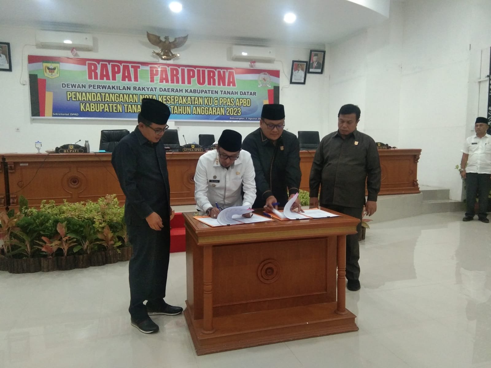 MATTANEWS.CO, TANAH DATAR – Paripurna Dewan Perwakilan Rakyat Daerah(DPRD) Tandatangani Nota kesepakatan Anggaran Pendapatan Belanja Daerah(APBD) Tanah Datar Tahun anggaran 2023, Rabu, 3/8/2022.