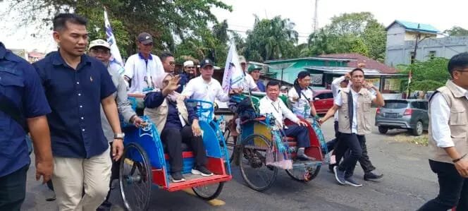 Pasangan ini memilih cara unik dan berkesan, datang ke KPU dengan menggunakan becak, diiringi oleh para pendukung setia yang turut meramaikan hari terakhir pendaftaran.