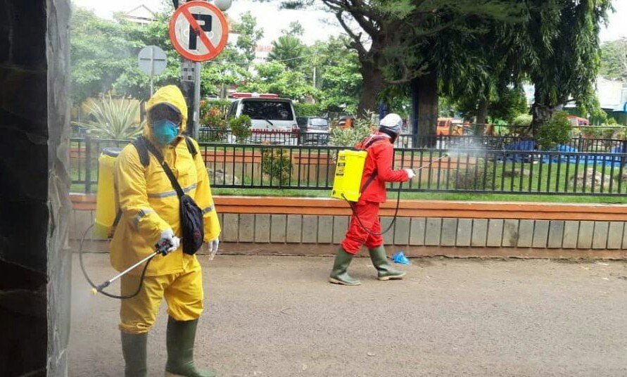 Hari ini tampak petugas sedang menyemprotkan disinfektan di tiap sudut Pasar Puri untuk mencegah penyebaran virus.
