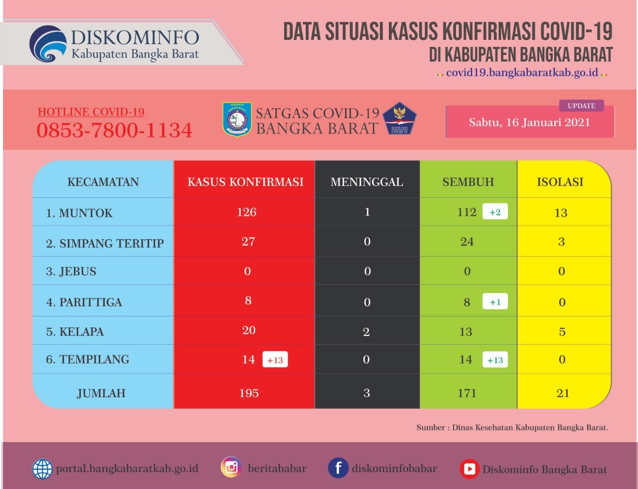 “Hal ini membuat total kasus positif di Kabupaten Bangka Barat menjadi 195 orang, dengan total jumlah pasien sembuh sebanyak 171 orang,” ungkapnya.