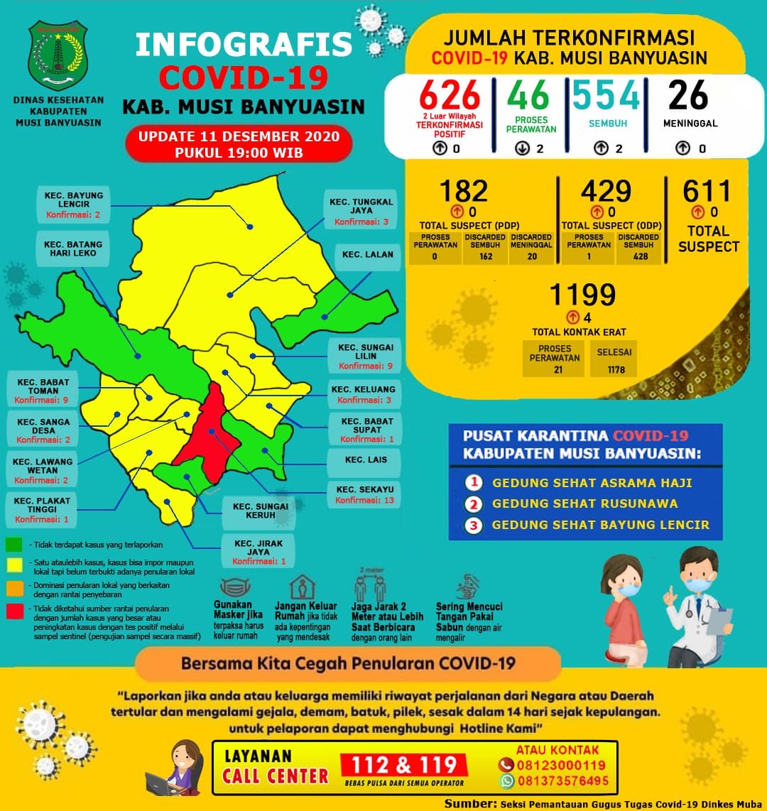 Kadin Kominfo Muba ini menambahkan, hingga 11 Desember 2020 tercatat ada 626 kasus konfirmasi di Muba.