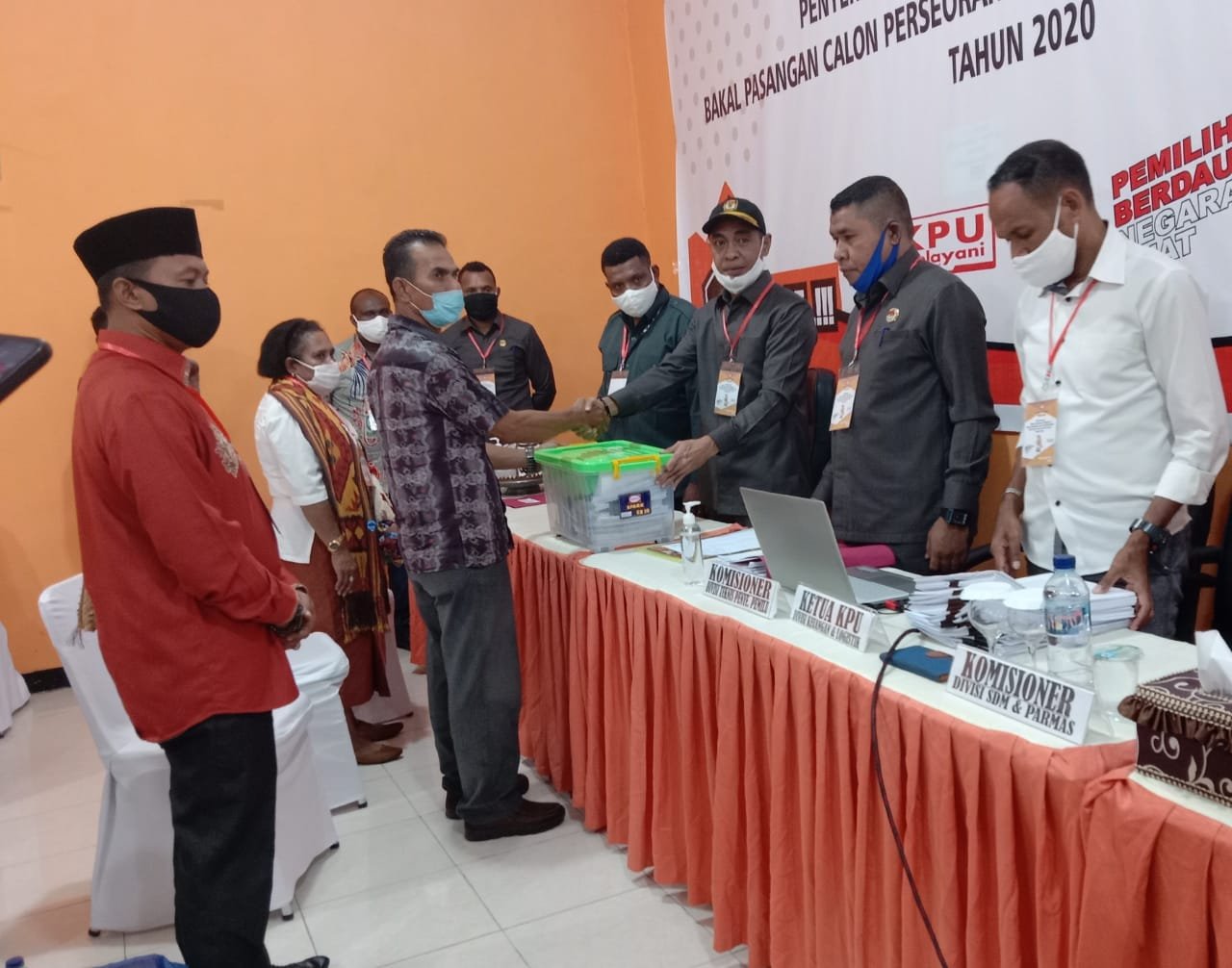 Penyerahan syarat dukungan perbaikan Paslon Untung Tamsil – Yohana Dina Hindom (UTAYO) diterima langsung Ketua KPU, Dihuru Dekri Radjaloa, didampingi tiga Komisioner KPU dan Pelaksana Tugas Sekretaris kPU Ochen Wairoy dengan disaksikan oleh Bawaslu Fakfak.
