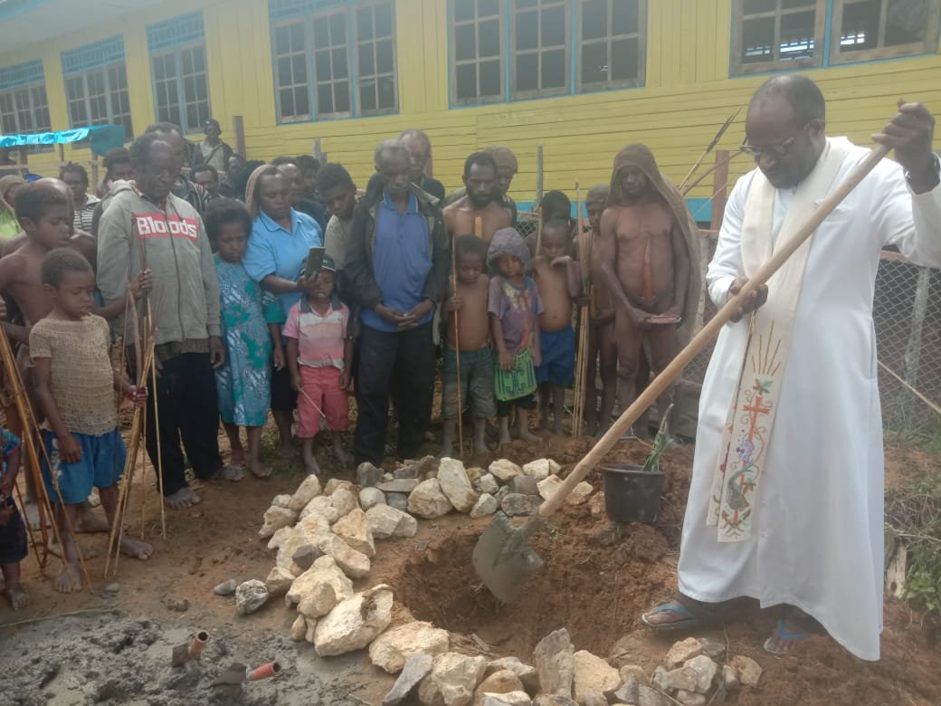 Peletakan batu pertama tersebut dikokohkan untuk mimpin misa oleh pastor paroki segala orang kudus Diyai, Yawina Damianus Adii, Pr.