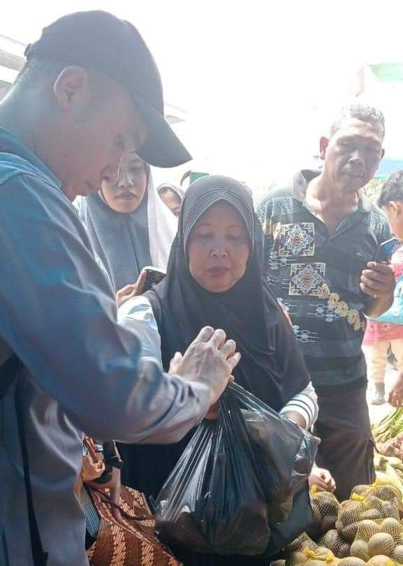 Disela sela kunjungan nya ke pasar gelugur Rantauprapat Presiden Membeli dagangan buah salah seorang pedagang yang berjualan di Pasar gelugur tersebut.