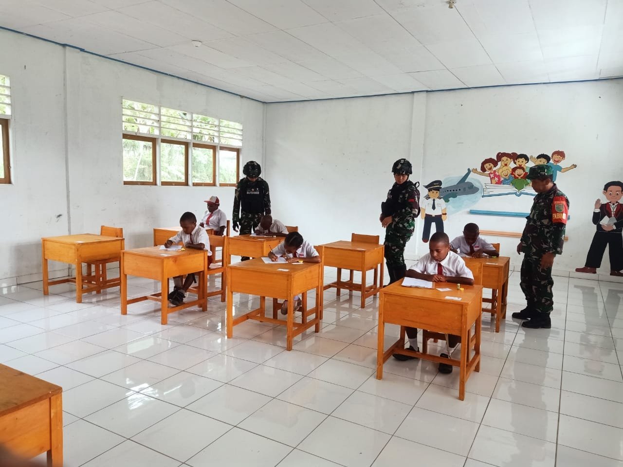 MATTANEWS.CO, PAPUA – Sebagai bentuk kepedulian di dunia pendidikan, Satgas Yonif Raider 200/BN dari Pos Kelila, membantu para guru dalam mengawasi pelaksanaan ujian di SDN Kelila Distrik Kelila, Kabupaten Mamberamo Tengah, Provinsi Papua Pegunungan, Senin (08/05/2023).
