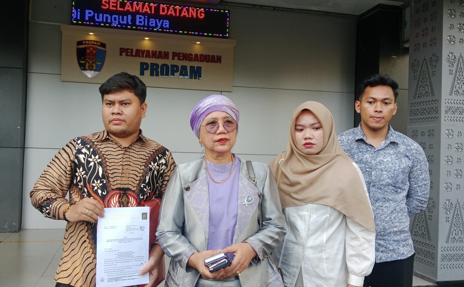 Didampingi kuasa hukumnya Prof Dr Hj Nurmalah SH MH dan tim, Ega Dwi Lestari anak almarhum Lilawati melaporkan Kanit Satlantas Polres Muba Aipda Suyanto ke Yanduan Propam Polda Sumsel, Palembang, Jumat (23/4/2026).
