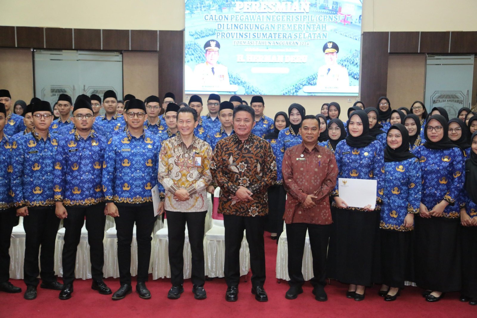 MATTANEWS.CO, PALEMBANG – Gubernur Sumatera Selatan (Sumsel) H. Herman Deru secara resmi melakukan Peresmian Calon Pegawai Negeri Sipil (CPNS) di lingkungan Pemprov Sumsel formasi tahun anggaran 2024 sebanyak 101 CPNS di Auditorium Bina Praja Pemprov Sumsel, Jumat (9/5/2025) siang.