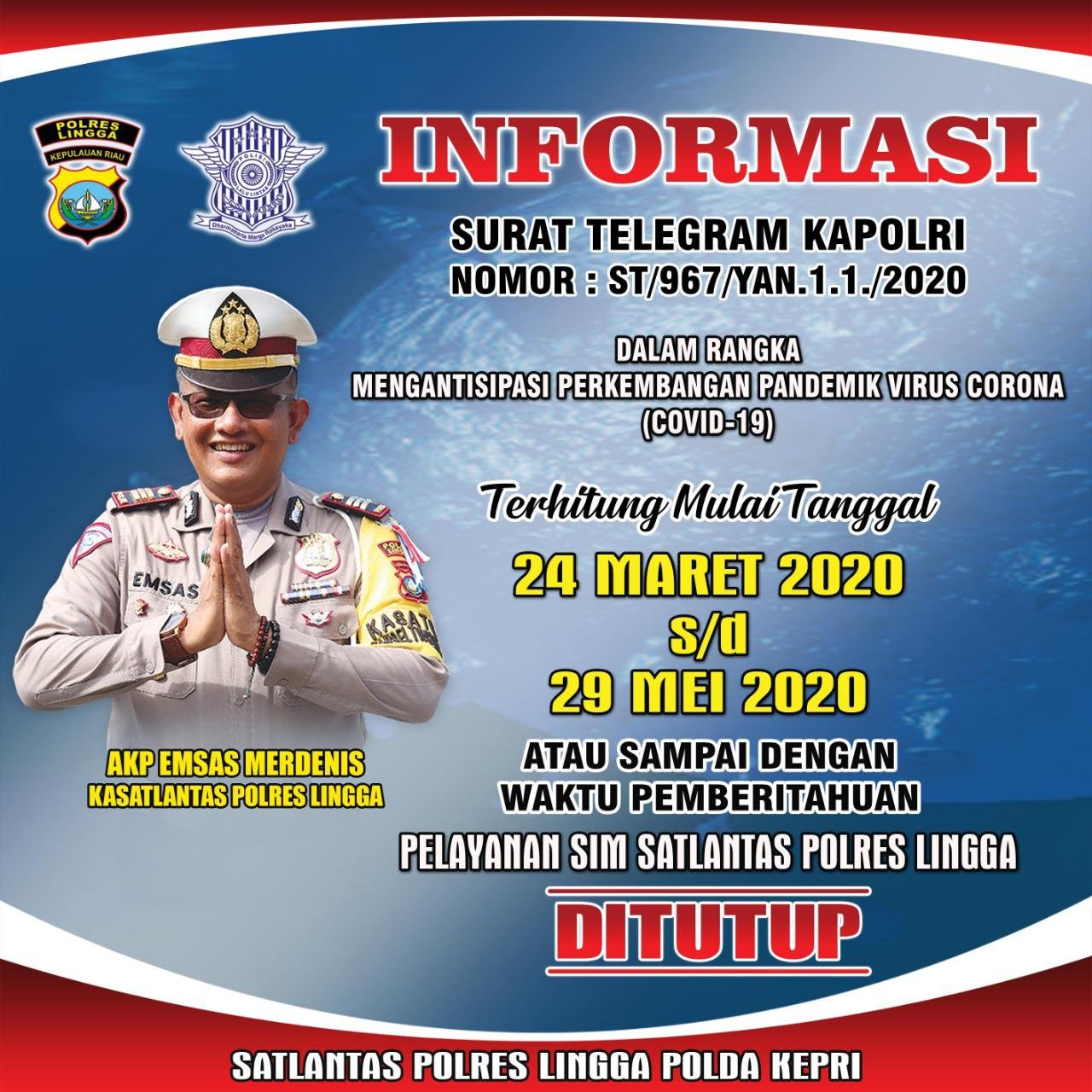 “Penutupan terhitung mulai tanggal 24 Maret 2020 sampai dengan tanggal 29 Mei 2020,” papar Kasatlantas Polres Lingga, AKP Emsas Merdenis, kepada wartawan media online ini.