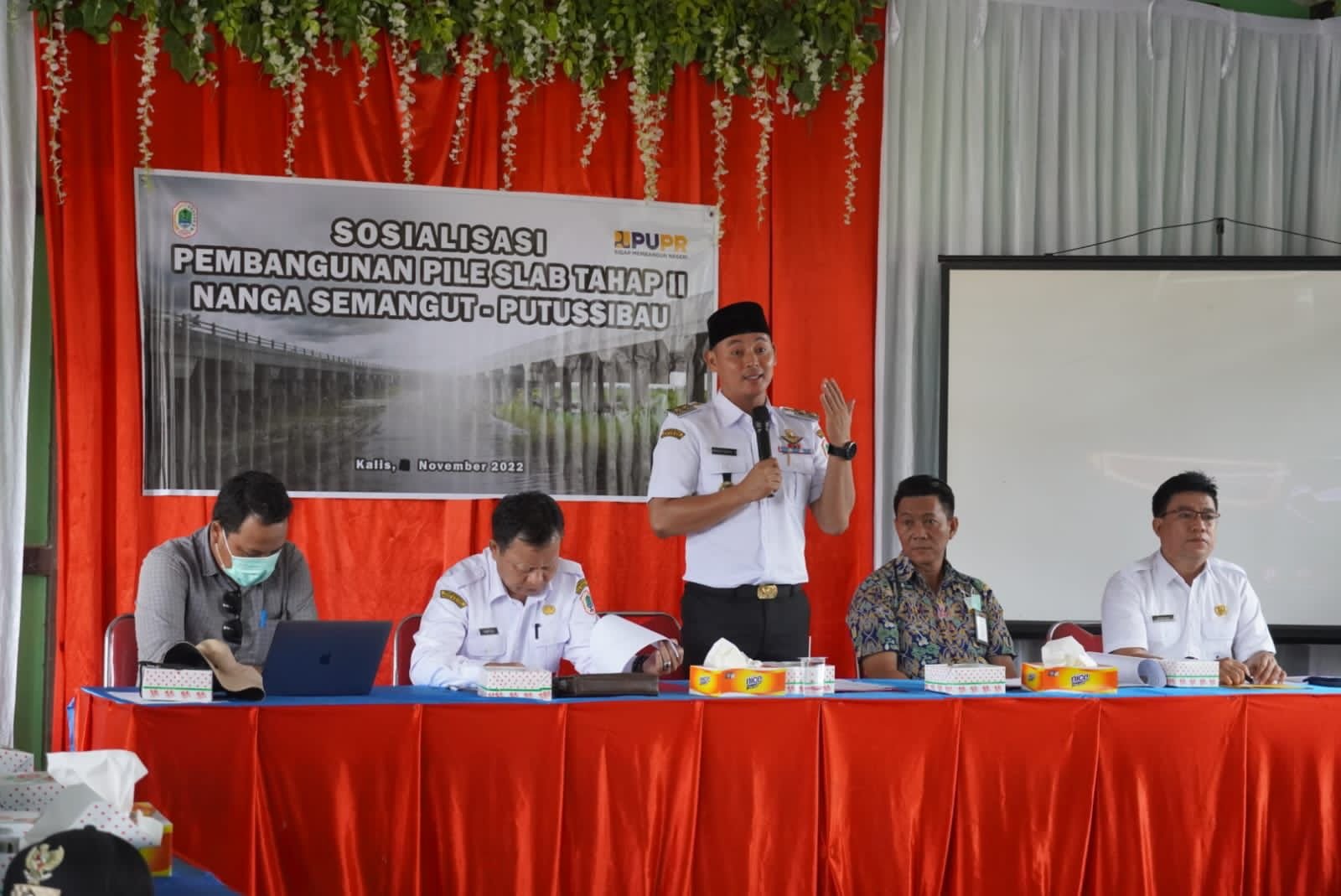 MATTANEWS.CO, KAPUAS HULU – Pemerintah Daerah Kabupaten Kapuas Hulu (Pemkab) bersama Balai Pelaksana Jalan Nasional (BPJN) Kalimantan Barat menggelar sosialisasi pembangunan pile slab tahap II Nanga Semangut – Putussibau di Desa Nanga Kalis, dihadiri masyarakat Kalis Kecamatan Kalis yang terdampak pembangunan pile slab II. Rabu (9/11/2022).