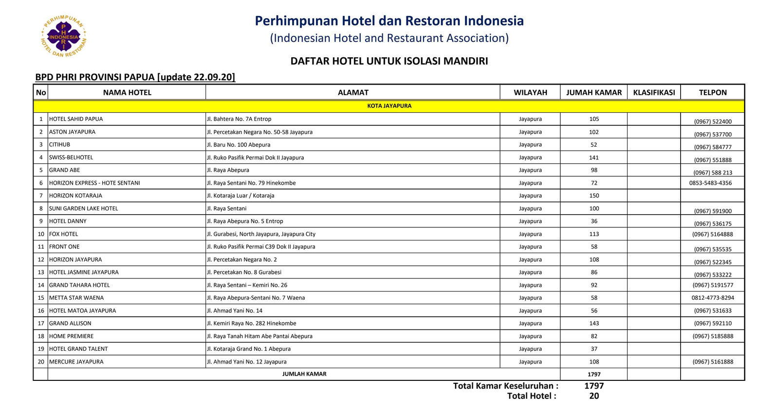 JAKARTA, Mattanews.co– Sebanyak 120 Hotel Isolasi Mandiri disiapkan pemerintah bekerja sama dengan Persatuan Hotel dan Restoran Indonesia (PHRI) untuk merawat pasien positif Covid-19 tanpa gejala atau OTG yang tidak memiliki tempat untuk menjalankan isolasi mandiri. Sejumlah hotel yang tersebar di sembilan provinsi itu memiliki kapasitas hunian sebanyak 13.334 tempat tidur.