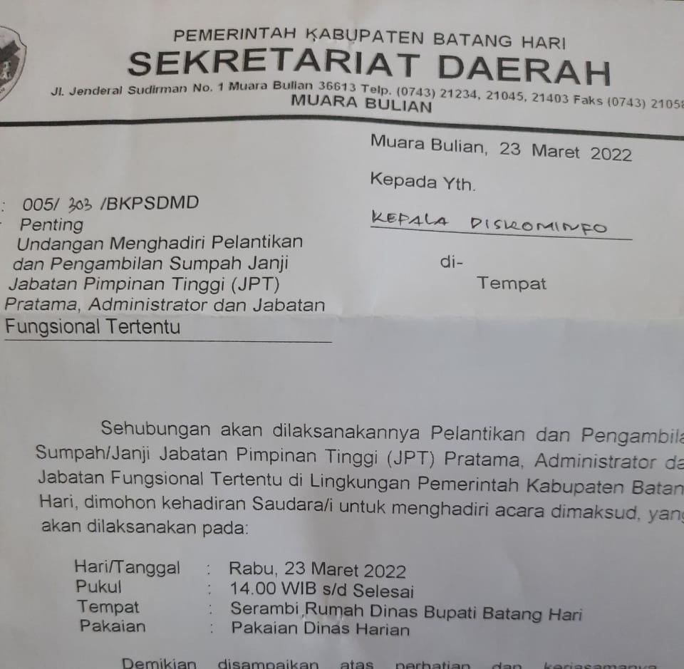 Berdasarkan surat undangan yang ditujukan kepada Kadis Kominfo nomor 005/303/BKPSDMD tanggal 23 Maret 2022, tentang undangan menghadiri Pelantikan dan Pengambilan Sumpah Janji Jabatan Pimpinan Tinggi (JPT) Pratama, Administrator dan Fungsional Tertentu yang akan dilaksanakan di serambi (Pendopo) Rumah Dinas Bupati Batanghari.