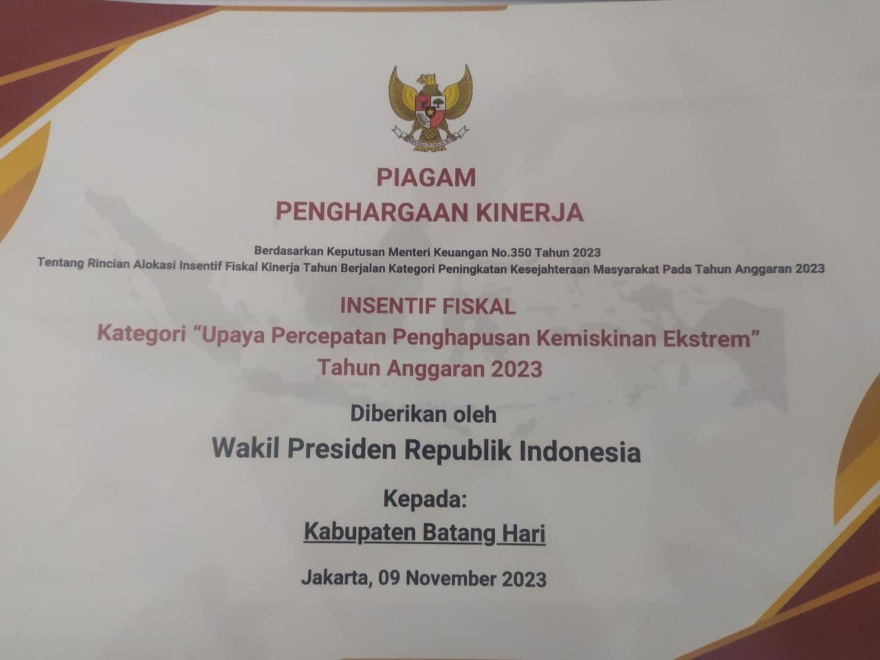 Wapres memberikan langsung Penghargaan di Istana Wapres Jalan merdeka Selatan Jakarta Pusat Pada Kamis (9/11/2023) dan penghargaan ini di terima langsung oleh Bupati Batanghari Muhammad Fadhil Arief.