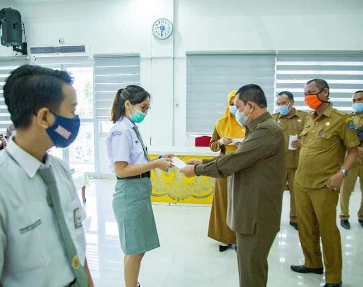LABUHANBATU, Mattanews.co – Sebanyak 26 orang mahasiswa asal Labuhanbatu secara simbolis menerima bantuan masuk Perguruan Tinggi Negeri jalur seleksi Nasional, masuk Perguruan Tinggi Negeri (SNMPTN) dan seleksi bersama masuk perguruan tinggi negeri (SBMPTN) tahun 2020 yang diserahkan langsung oleh Pjs. Bupati Labuhanbatu Drs H Mhd Fitryus, SH MSP di ruang Data dan karya Bupati Labuhanbatu, Senin (30/11).