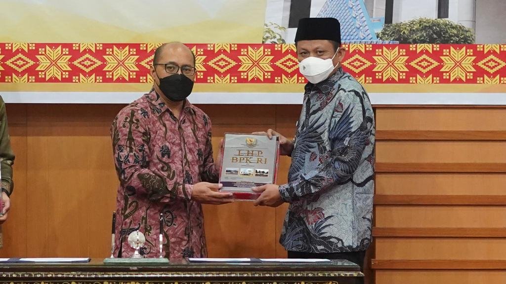BPK RI menyerahkan LHP atas LKPD kepada perwakilan BPK RI Perwakilan Provinsi Sumatera Selatan Harry Purwaka, S.E., MSF., Ak., CA., CSFA. yang selanjutnya memberikan kepada Bupati OKU Timur H. Lanosin, S.T. di Gedung BPK RI Perwakilan Sumatera Selatan. Selasa, 26 April 2022.
