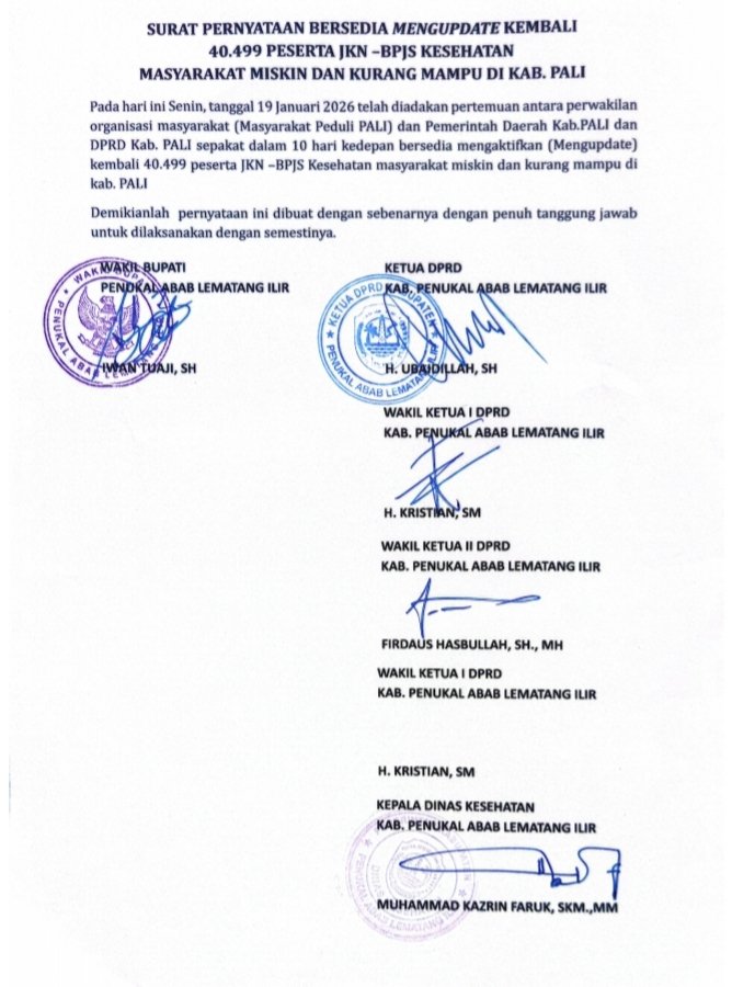 MATTANEWS.CO, PALI – Tekanan ribuan massa yang tergabung dalam Masyarakat Peduli PALI (MPP) akhirnya membuahkan hasil. Pemerintah Kabupaten (Pemkab) Penukal Abab Lematang Ilir (PALI) resmi menyetujui tuntutan massa aksi untuk mengaktifkan kembali kepesertaan Badan Penyelenggara Jaminan Sosial (BPJS) Kesehatan bagi 40.499 warga, yang sebelumnya dinonaktifkan sejak 01 Januari 2026.