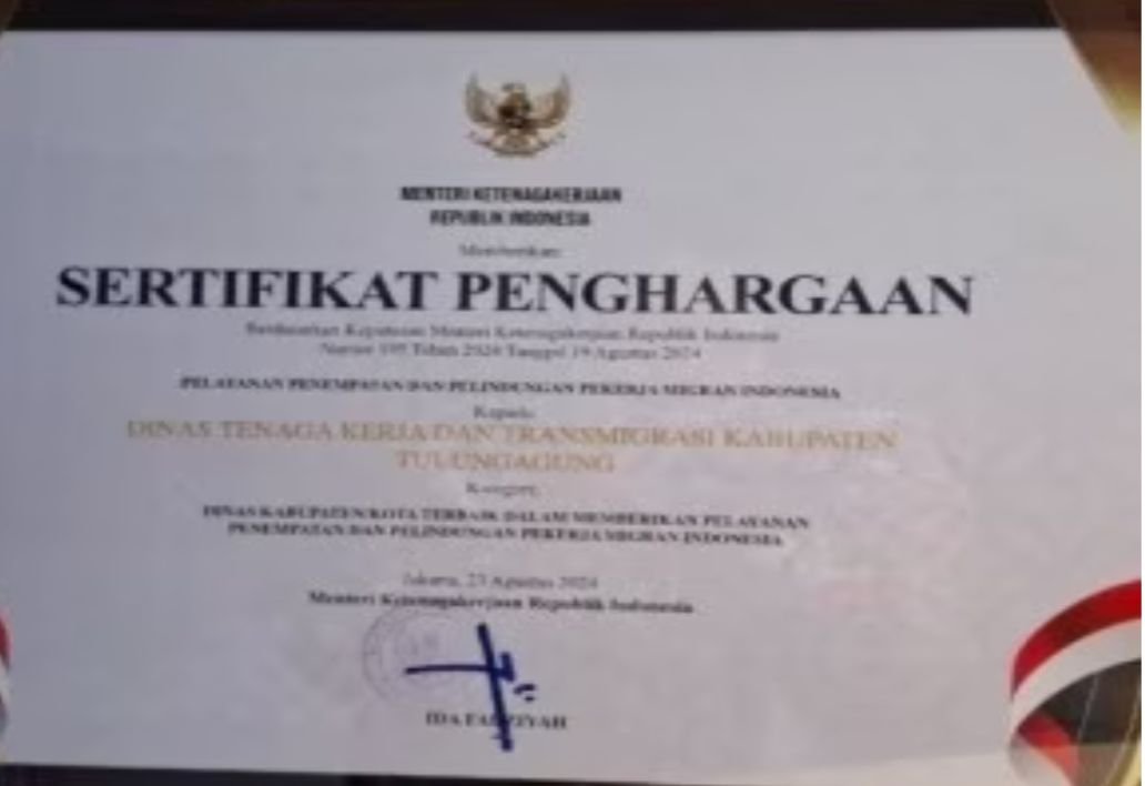 “Prestasi ini dapat menjadi inspirasi bagi daerah lain khususnya di wilayah Jawa Timur dalam memperkuat kebijakan dan layanan di sektor ketenagakerjaan. Semoga dengan apa yang didapatkan saat ini bisa menambah semangat kinerja kami dan bisa lebih berinovasi untuk kemanfaatan masyarakat Tulungagung pada umumnya dan PMI khususnya serta pemerintah,” pungkasnya.