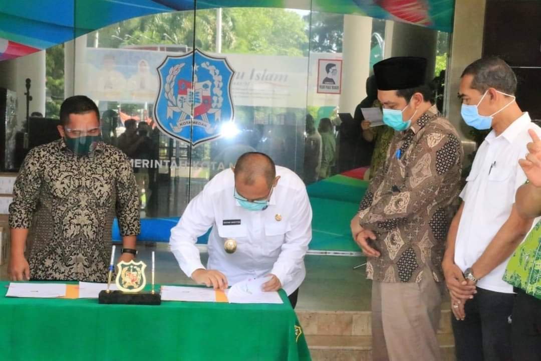 Penyerahan ditandai dengan penandatangan Naskah Perjanjian Hibah oleh Pelaksana tugas (Plt) Wali Kota Medan Ir H Akhyar Nasution MSi bersama Ketua KPU Agussyah Damanik dan Ketua Bawaslu Payung Harahap di Balai Kota Medan, Kamis (3/9).