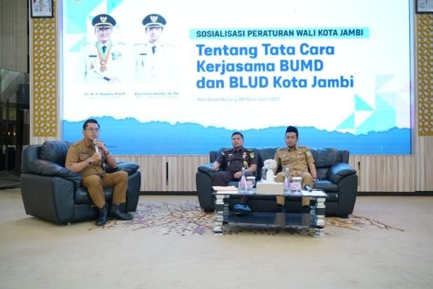 MATTANEWS.CO, JAMBI – Pemerintah Kota (Pemkot) Jambi bersama Kejaksaan Negeri (Kejari) Jambi memperkuat sistem tata kelola Badan Usaha Milik Daerah (BUMD) dan Badan Layanan Umum Daerah (BLUD) melalui kegiatan Sosialisasi Peraturan Wali Kota Jambi tentang tata cara kerja sama BUMD dan BLUD. Kegiatan ini berlangsung di Aula Griya Mayang, Rumah Dinas Wali Kota Jambi, Senin (08/12/2025).