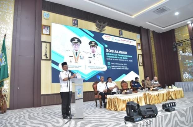 Sosialisasi pembangunan Jargas digelar di Ballroom Grha Siginjai Kantor Wali Kota Jambi, Rabu (3/12/2025). Para Camat, Lurah, dan Ketua RT dari wilayah sasaran hadir langsung, khususnya dari Kecamatan Alam Barajo dan Kotabaru. Tahun ini, Kota Jambi mendapat bantuan Pemerintah Pusat sebanyak 13.235 Sambungan Rumah (SR) di lima kelurahan.