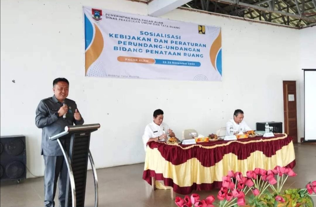 MATTANEWS.CO PAGAR ALAM – Pj Sekretaris Daerah (Sekda) Kota Pagar Alam Rano Fahlesi membuka secara resmi sosialisasi kebijakan dan peraturan perundang-undangan bidang penataan ruang, di Aula Hotel Dempo Flower, Kota Pagar Alam Sumsel , Rabu (22/11/2023).