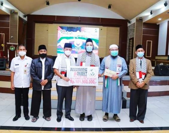 Tak kurang dari 100 jutaan lebih, dana yang diserahkan secara simbolis oleh Wawako H. Andriansyah Fikri kepada Syeikh Bilal Abu Abdul Rahman, untuk warga Palestina yang tengah mengalami konflik yang mendera sebagian umat muslim disana.