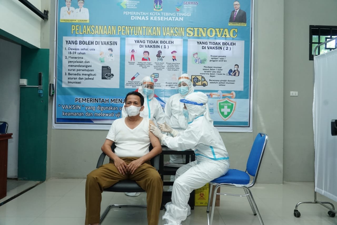 MATTANEWS,CO. TEBING TINGGI – Pemerintah Kota (Pemkot) Tebing Tinggi Sumatera Utara (Sumut) melaksanakan vaksinasi Covid-19 tahap pertama, di Kantor Dinas Kesehatan (Dinkes) Tebing Tinggi, Senin (8/2/2021).