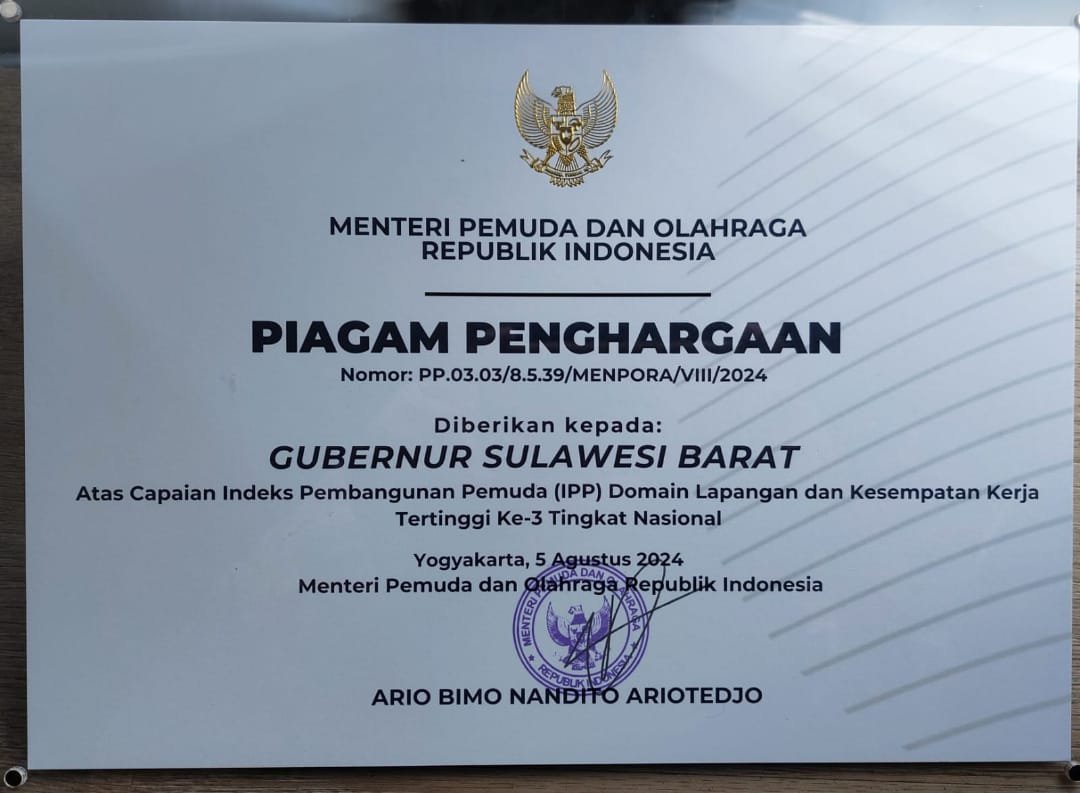 Penghargaan tersebut diperoleh dari kategori Domain Lapangan dan Kesempatan Kerja Kepemudaan. Dalam kategori ini Sulbar berhasil meraih posisi Tertinggi ke-3 Tingkat Nasional, dengan nilai 55,00.