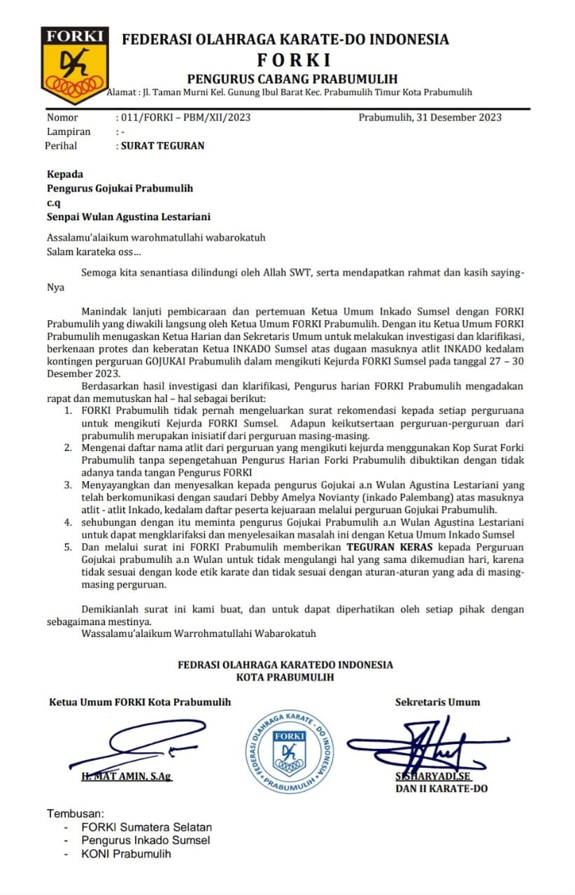 Kata Ustadz Amin, sapaan akrabnya, pihaknya telah mengeluarkan surat teguran tegas kepada pengurus GOJUKAI Prabumulih telah memakai kop surat FORKI Prabumulih tanpa izin dan lebih lagi menggunakan atlit INKADO dalam Kejurda FORKI Sumsel.