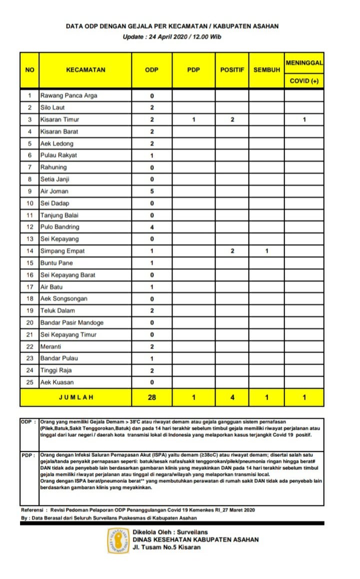 Dijelaskannya dari ODP, PDP dan positif tersebut tersebar di 14 Kecamatan dari 25 Kecamatan yang ada di Asahan, yaitu Kecamatan Silau Laut 2 orang ODP, Kisaran Timur 2 ODP, 1 PDP, 2 orang Positif ( telah meninggal 1 orang), Kisaran Barat 2 orang ODP, Aek Ledong 2 orang ODP, Pulau Rakyat 1 orang ODP, Air Joman 5 orang ODP, Pulo Bandring 4 orang ODP, Simpang Empat 2 orang Positif Covid -19 dan 1 orang telah sembuh, Buntu Pane 2 orang ODP, Air Batu 1 orang ODP, Teluk dalam 2 orang ODP, Meranti 2 orang ODP, Bandar Pulau 1 orang ODP dan Tinggi Raja 2 orang ODP.